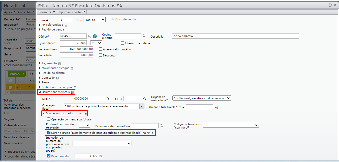 1) Para incluir o lote registrado no XML de uma NF-e, marque a opção “Gerar o grupo “Detalhamento de produto sujeito a rastreabilidade” na NF-e”. Para isso, na tela de edição do item da NF, expanda a seção “Dados fiscais > Outros dados fiscais”:
