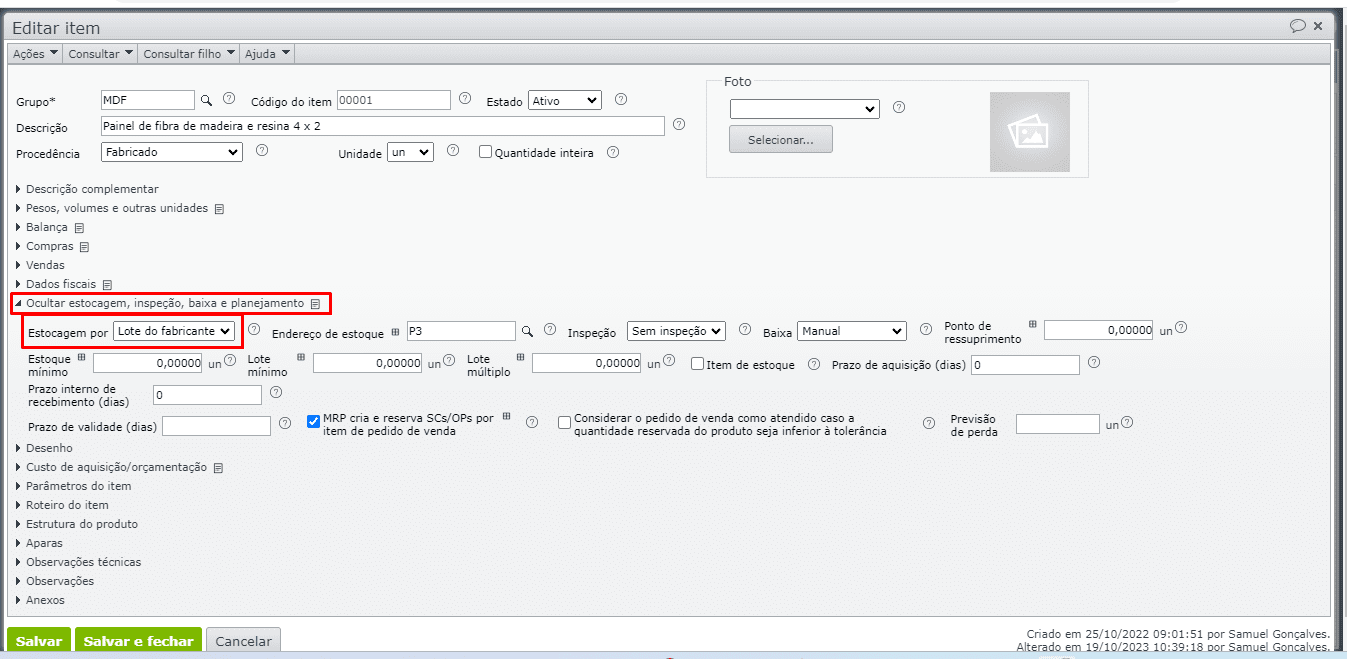 b) Na tela de edição do item, expanda a seção “Estocagem, inspeção, baixa e planejamento” e preencha o campo “Estocagem por” com uma das opções “Lote do fabricante” ou “Número de série”. Clique em “Salvar”.