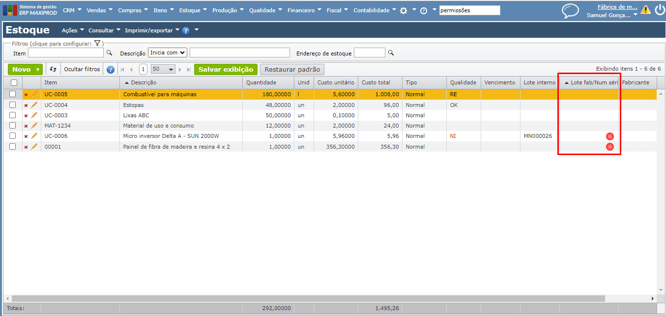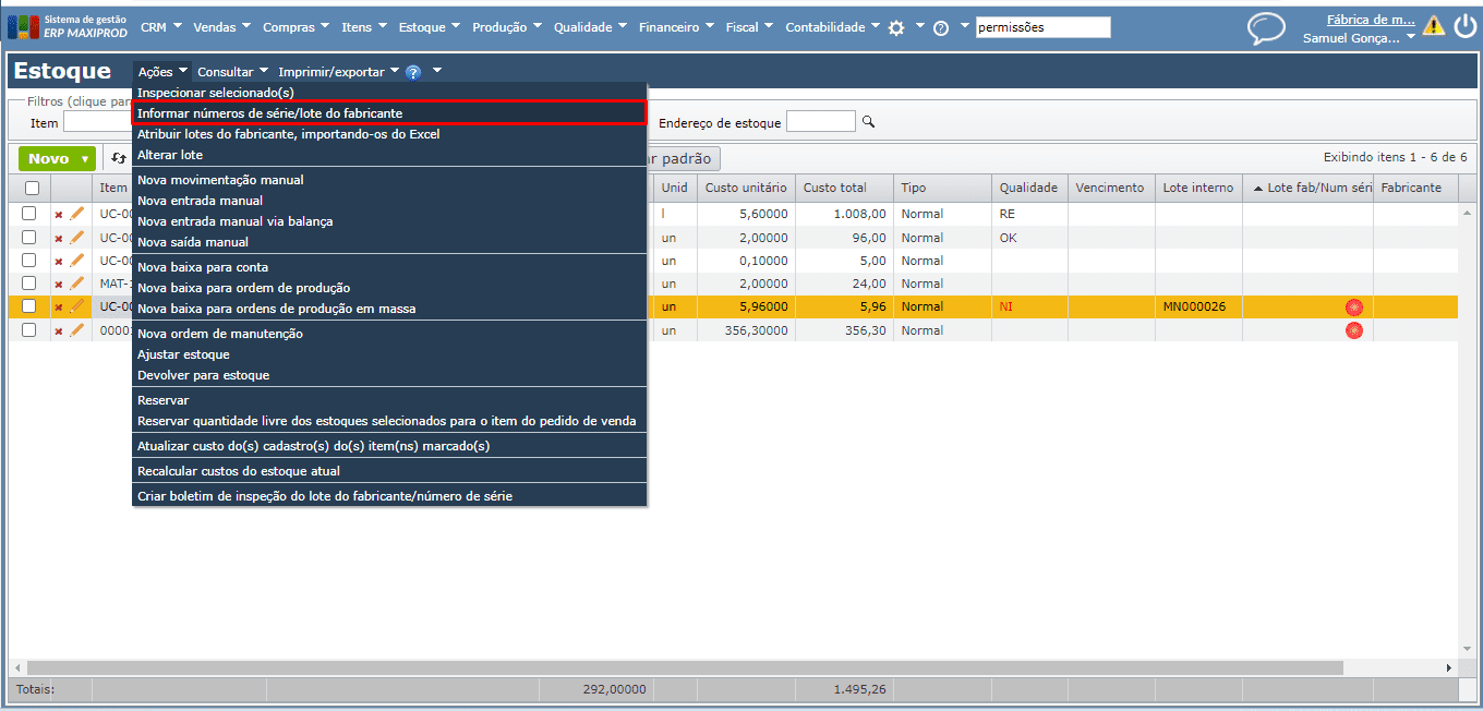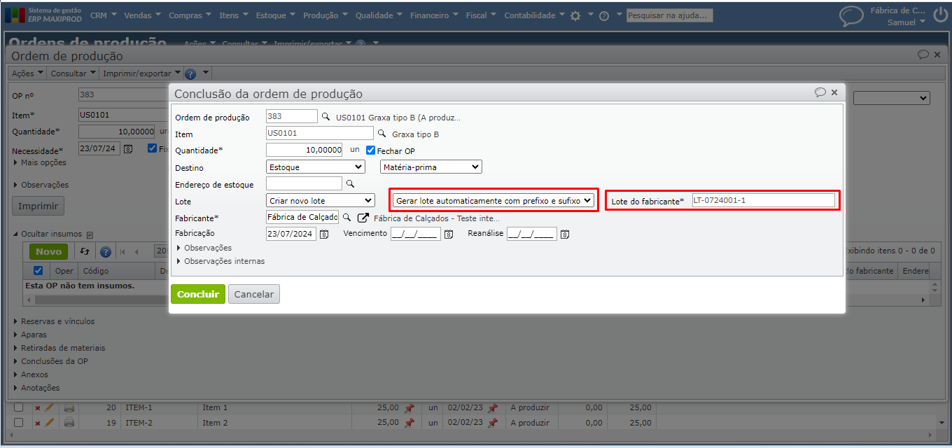 - lote do fabricante ou número de série: atribuído pelo fabricante. Quando o item é fabricado pela própria empresa, é igual ao lote interno, ou seja, também terá o prefixo OP.