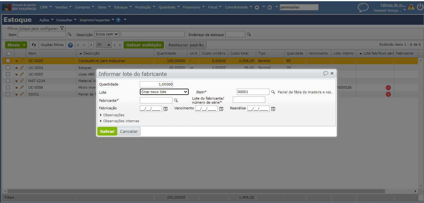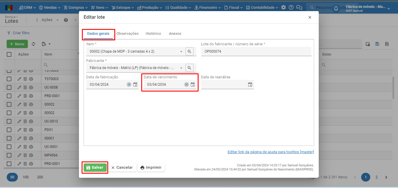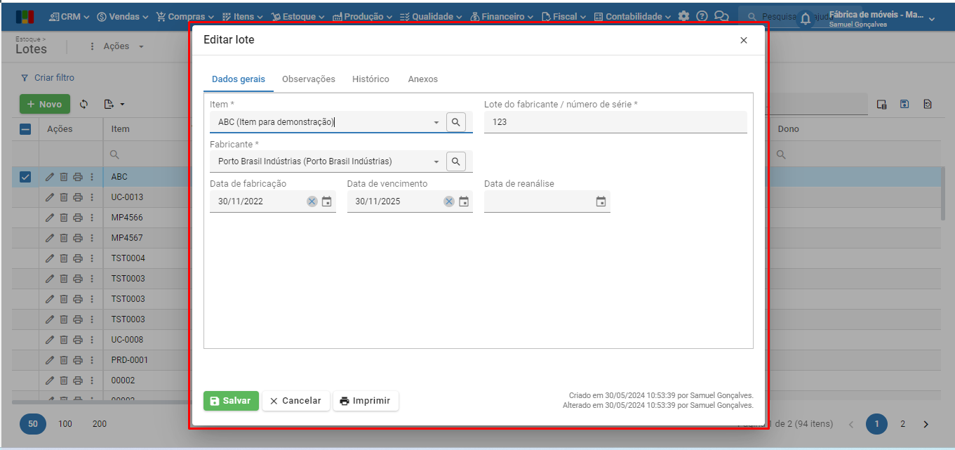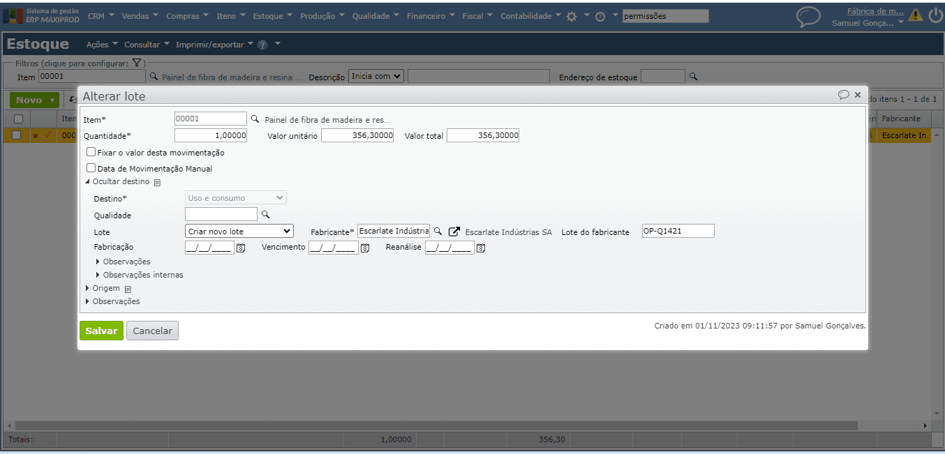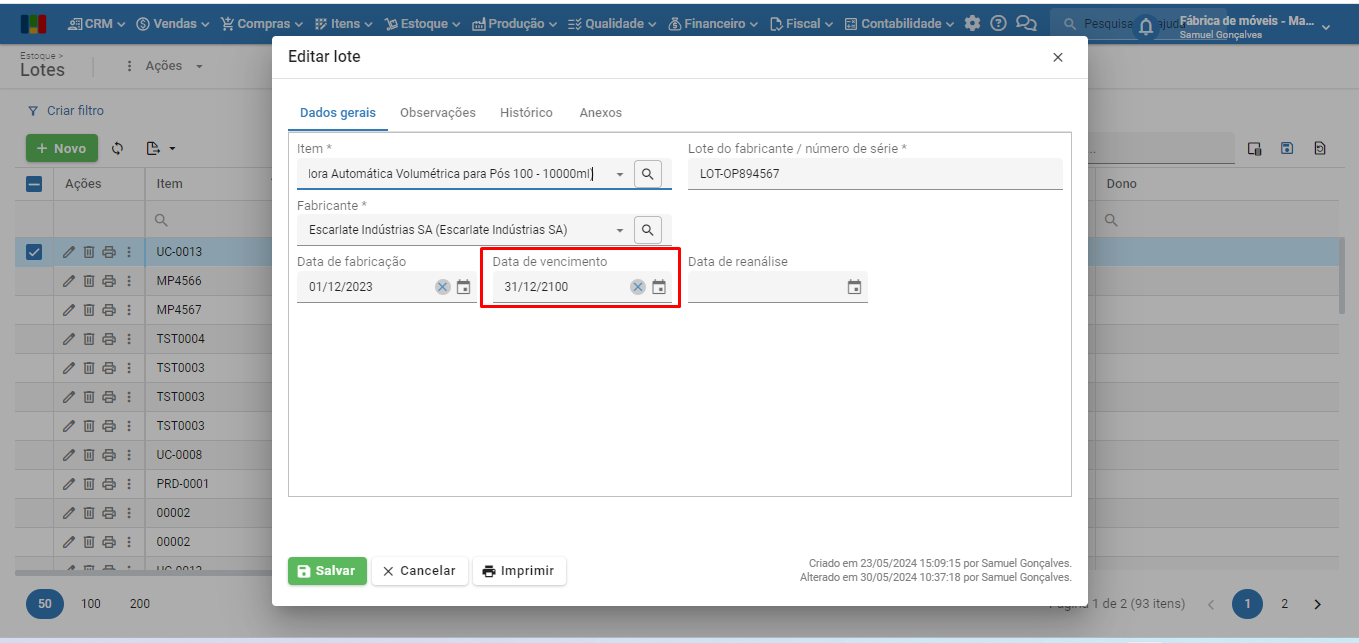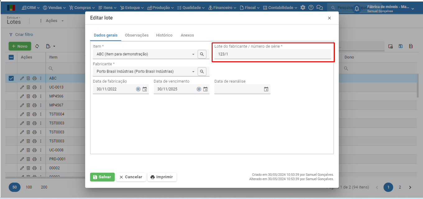 2) Na janela aberta, preencha os campos necessários, criando o novo lote/número de série ou selecionando lote/número de série já cadastrado, e clique em “Salvar”.