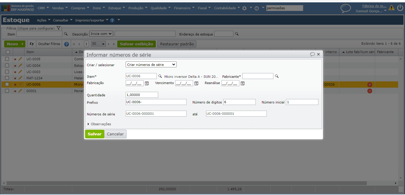 - Prefixo: valor inicial fixo dos lotes e números de série a serem criados.