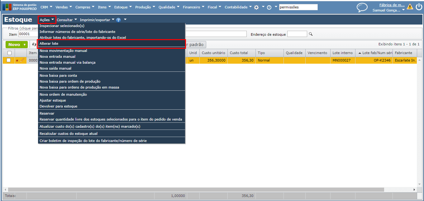 1) Na grade de estoque (“Estoque > Estoque”), selecione o registro de estoque cujo lote/número de série deseja alterar, e acesse o submenu “Ações > Alterar lote”.