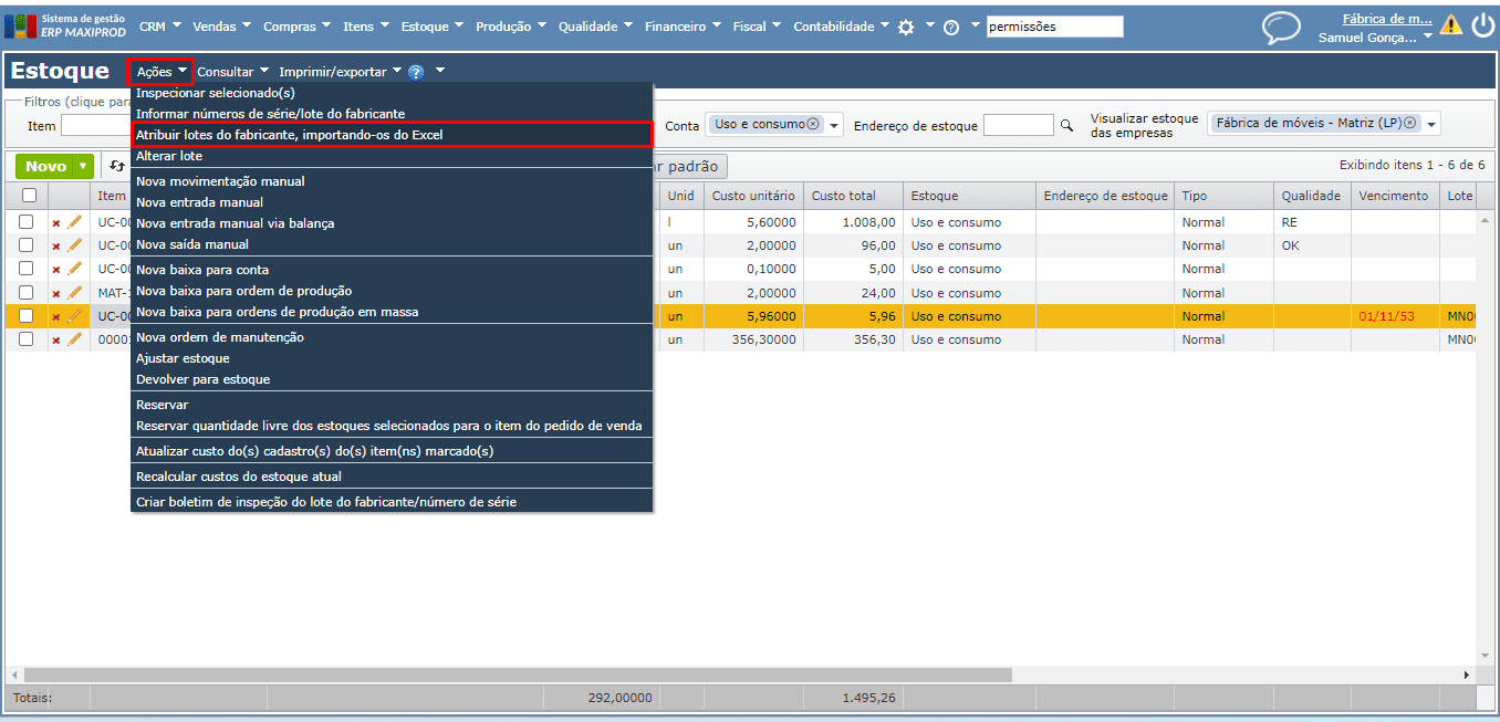 1) Acesse o menu superior “Estoque > Estoque”. Na tela de estoque, acesse “Ações > Atribuir lotes do fabricante, importando-os do Excel”. Apesar desta opção falar apenas em lote, são também importados os números de série.