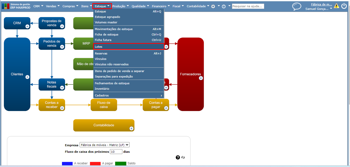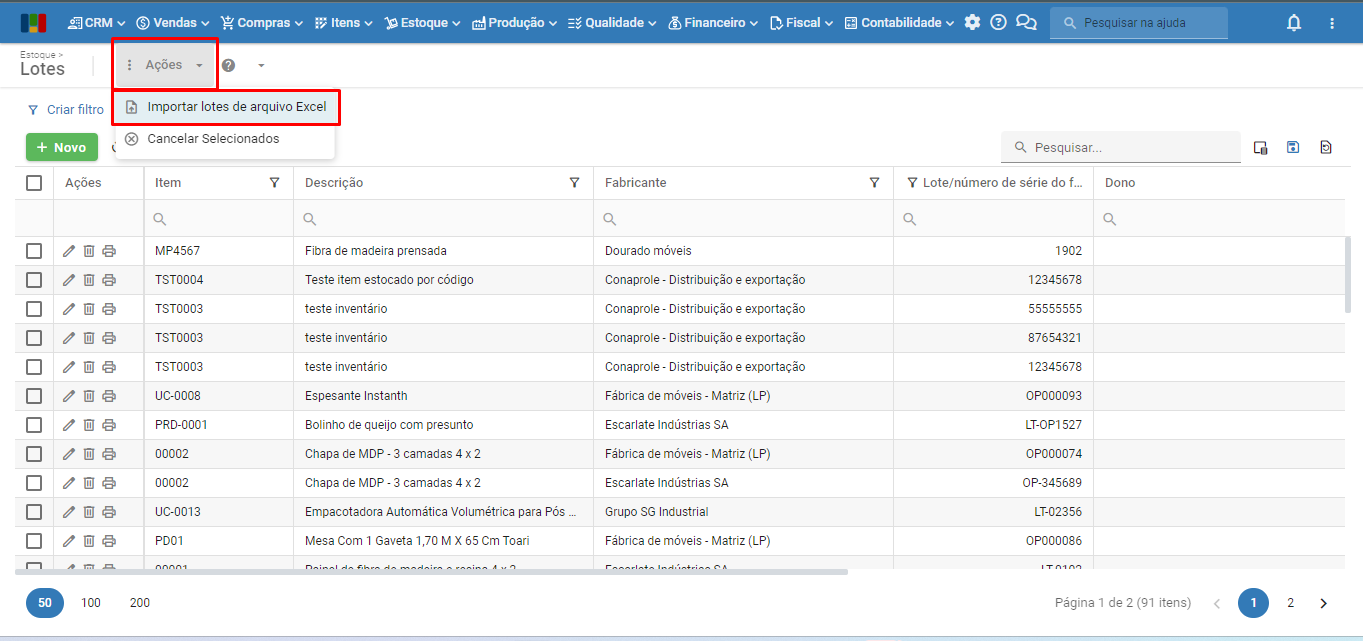 1) Pode-se cadastrar lotes do fabricante em massa, por importação de arquivo Excel. Para isso, acesse “Estoque > Lotes”.