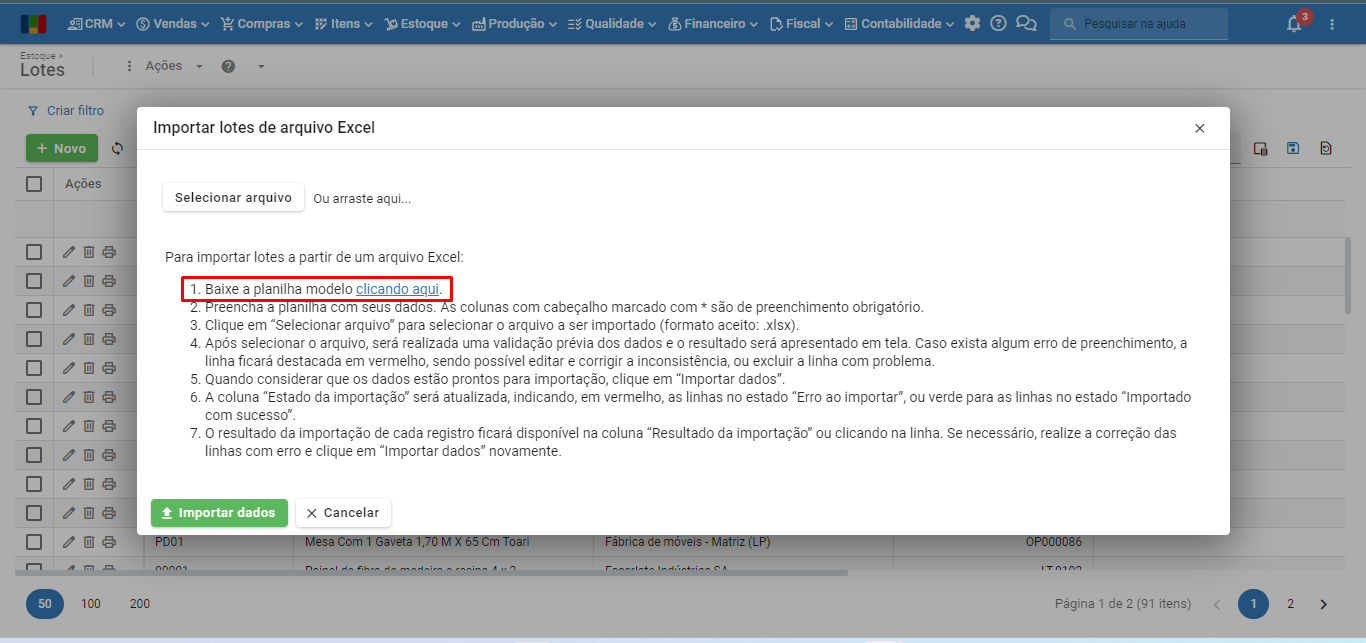 3) Na janela aberta, baixe a planilha-modelo para preenchimento, conforme explicado no ponto 1 da janela de importação.