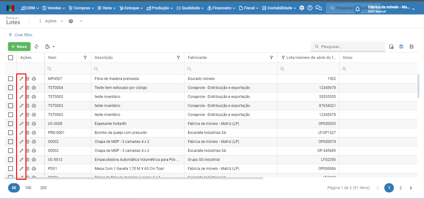 2) Clique no ícone do lápis ao lado do lote que deseja editar.