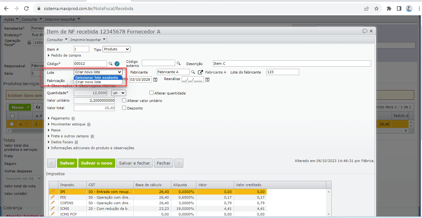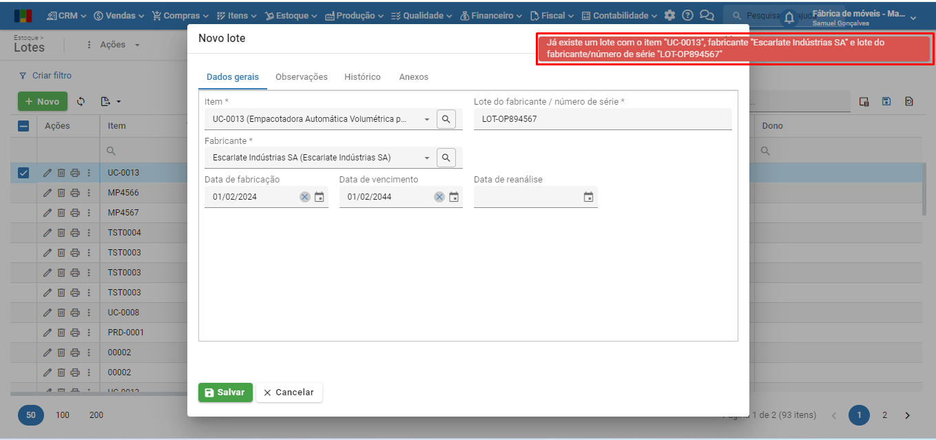 1) No ERP MAXIPROD, não é permitido criar um segundo lote com os mesmos valores nos campos “item”, “fabricante”, “lote do fabricante/nº de série” de lote já cadastrado no sistema, mesmo que informada data de fabricação ou vencimento diferente. O sistema retorna a seguinte mensagem: