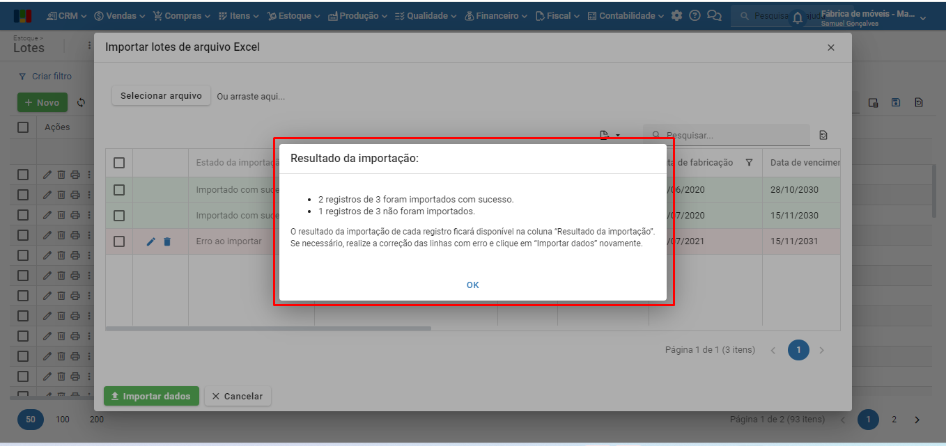 9) Após clicar em “Ok”, as linhas não importadas podem ser conferidas pela grade. O resultado ficará disponível na coluna “Resultado da importação”. Se necessário, corrija as linhas com erros e clique em “Importar dados” novamente.