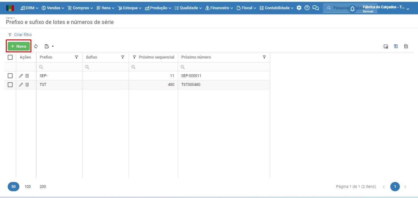 2) Clique no botão verde “+ Novo” para cadastrar um novo prefixo e sufixo de lotes e números de série.