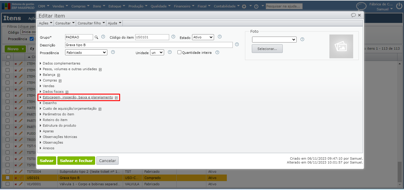 2) Edite o cadastro do item e expanda a seção “Estocagem, inspeção, baixa e planejamento”.