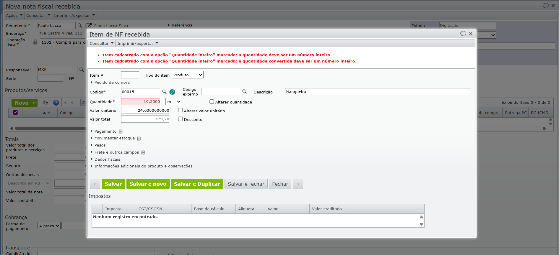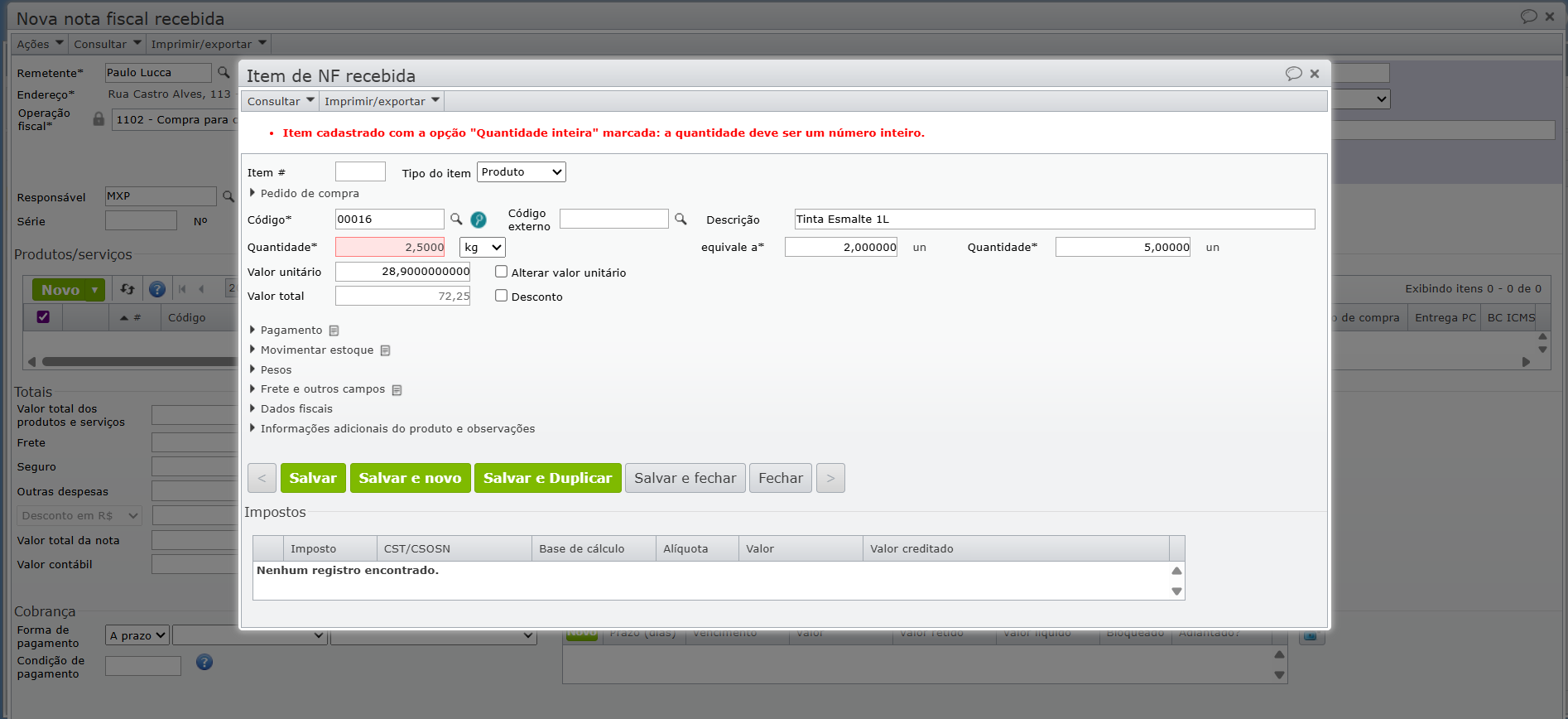a) Se o usuário tentar inserir uma quantidade não inteira em uma unidade marcada como inteira de um item que fará conversão, o sistema também exibirá a mensagem: