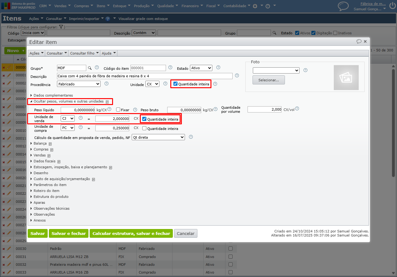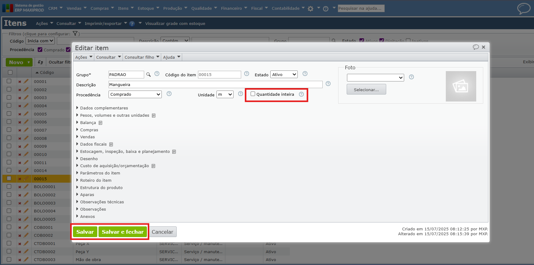 c) Se o item pode ter quantidades não inteiras, desmarque a opção “Quantidade Inteira” no cadastro.