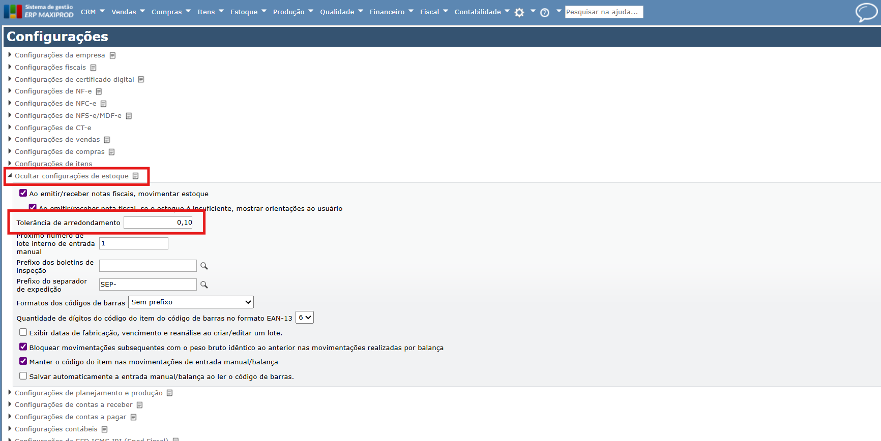 3) A tolerância de conversão para uma unidade inteira é definida nas configurações de estoque (menu “Roda dentada > Configurações > Configurações de estoque”), campo “Tolerância de arredondamento”, sendo inicializada em 0,1.