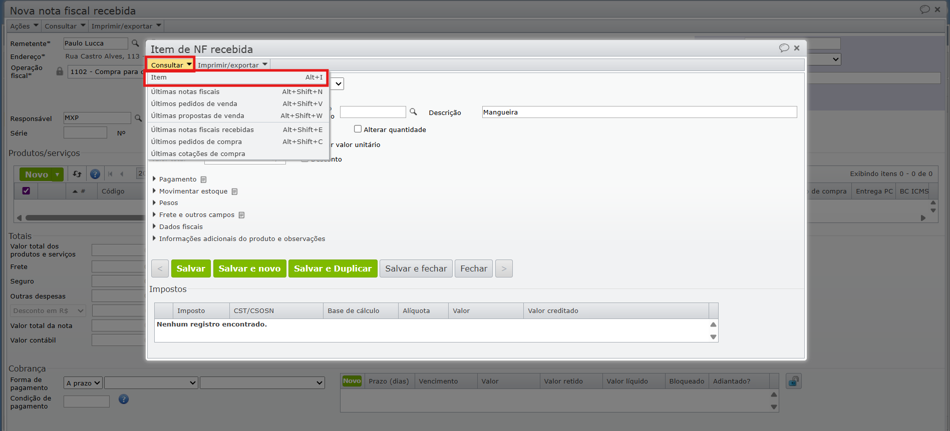 3) Também é possível acessar a tela de cadastro do item através do menu “Consultar > Item” exibido na janela de edição do item na entidade que estiver editando, como pedidos ou notas fiscais.