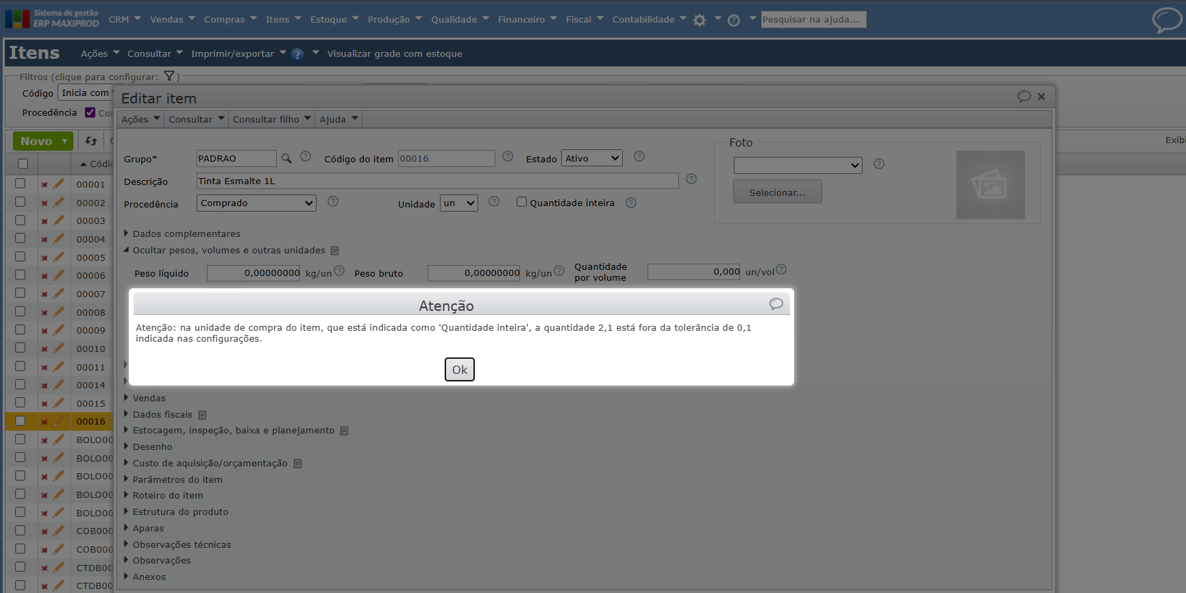 “Atenção: na unidade de medida do item, que está indicada como “Quantidade inteira”, a quantidade ***,*** está fora da tolerância de 0,** indicada nas configurações.”