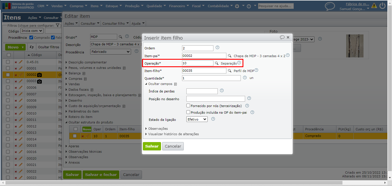 Esta mensagem é exibida quando o usuário tenta inserir um item-filho na estrutura de um produto, com o mesmo código do item, mesma operação e posição de outro item-filho, já inserido previamente. No exemplo abaixo, o item-filho 00035 já está na estrutura de produto do item 00002, na operação “10 – Separação” e “Posição no desenho” em branco.
