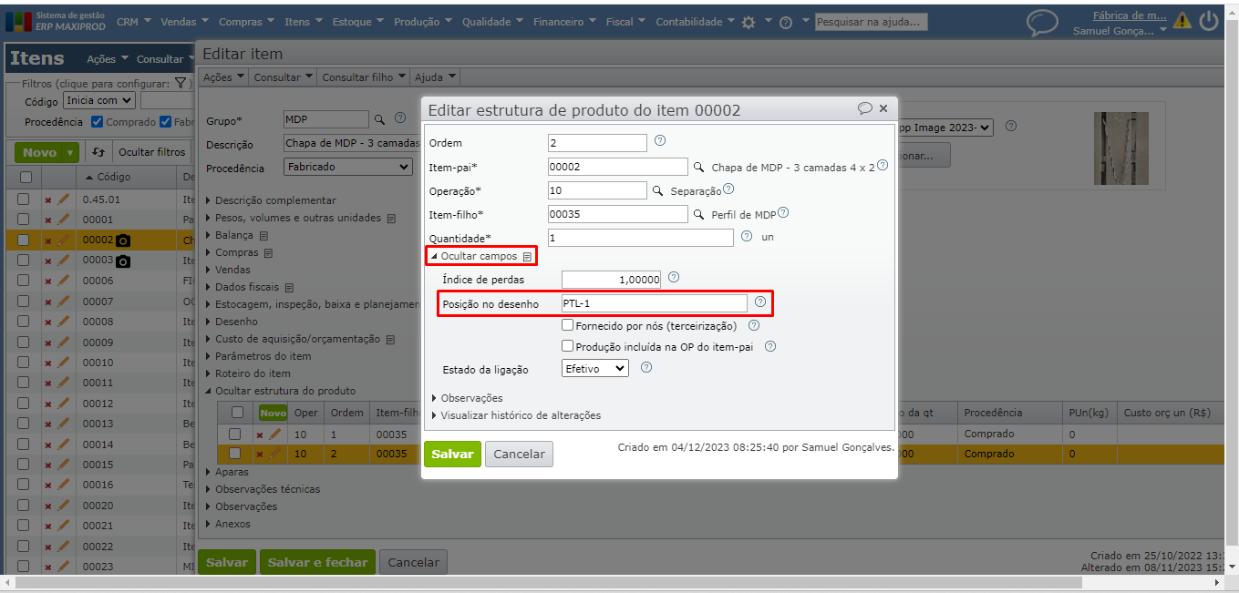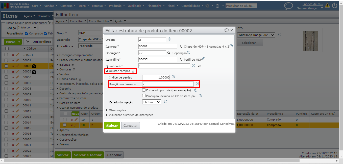 a) O campo “Posição no desenho” fica na seção “Mais campos” da janela de edição do item-filho, é alfanumérico e de livre preenchimento, e indica a posição do item-filho no desenho do item-pai.