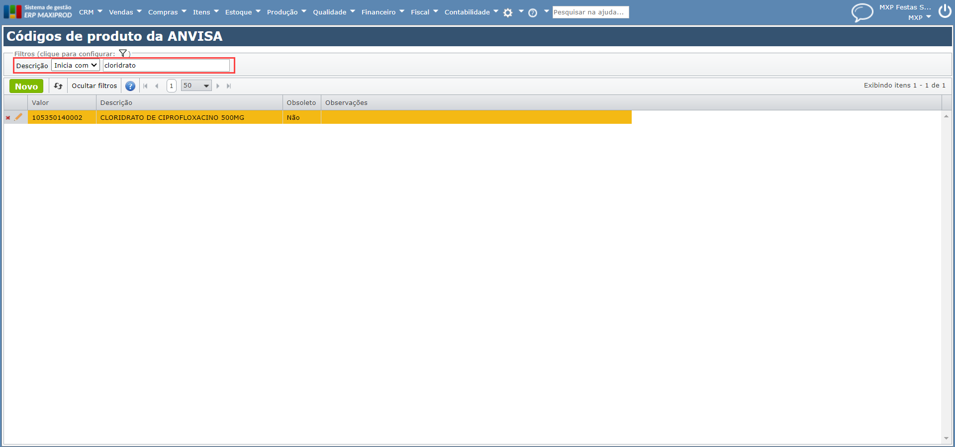 6) Informe a descrição do código ANVISA no filtro “Descrição”.