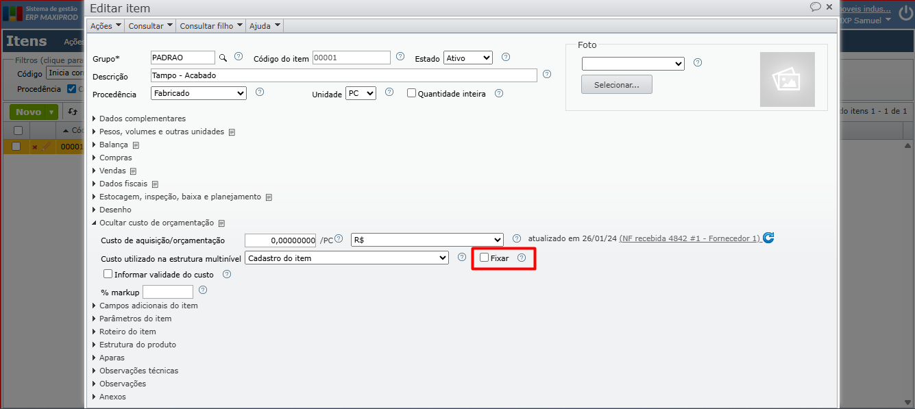 4) Desmarque a opção “Fixar“, indicando que o custo de aquisição/orçamentação não deve ser fixo.