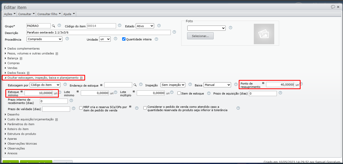 4) Na seção “Estocagem, inspeção, baixa e planejamento”, preencha os campos “Ponto de ressuprimento” e/ou “Estoque mínimo”.
