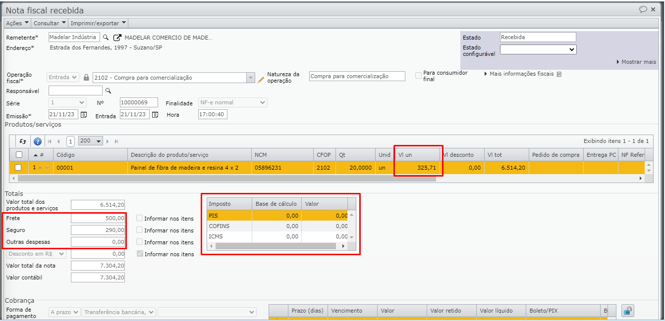 - No exemplo abaixo, o custo foi atualizado pelo recebimento do item 1 da NF 10000069 do fornecedor “Madelar Indústria”.