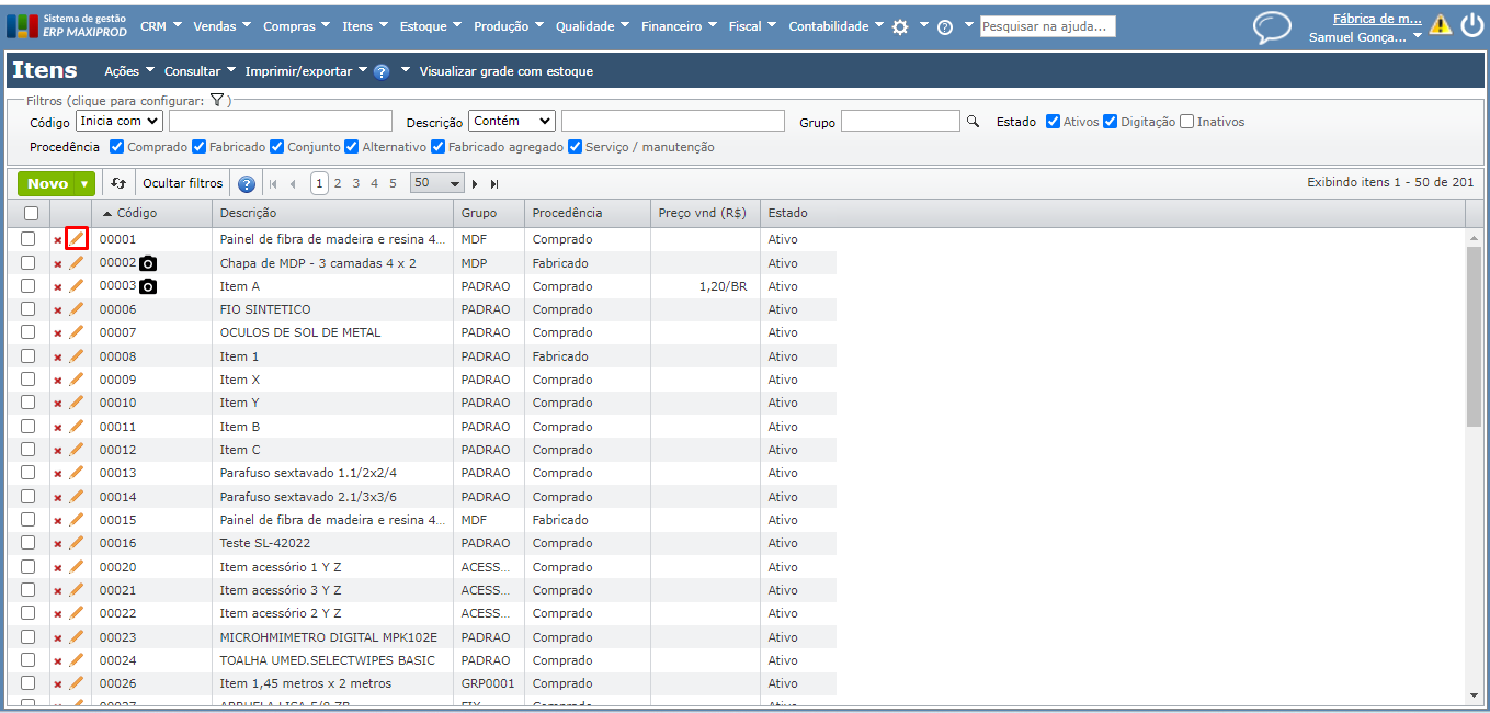 2) Localize o cadastro do item e clique no ícone do lápis ou duplo-clique na linha para abrir a janela de edição.