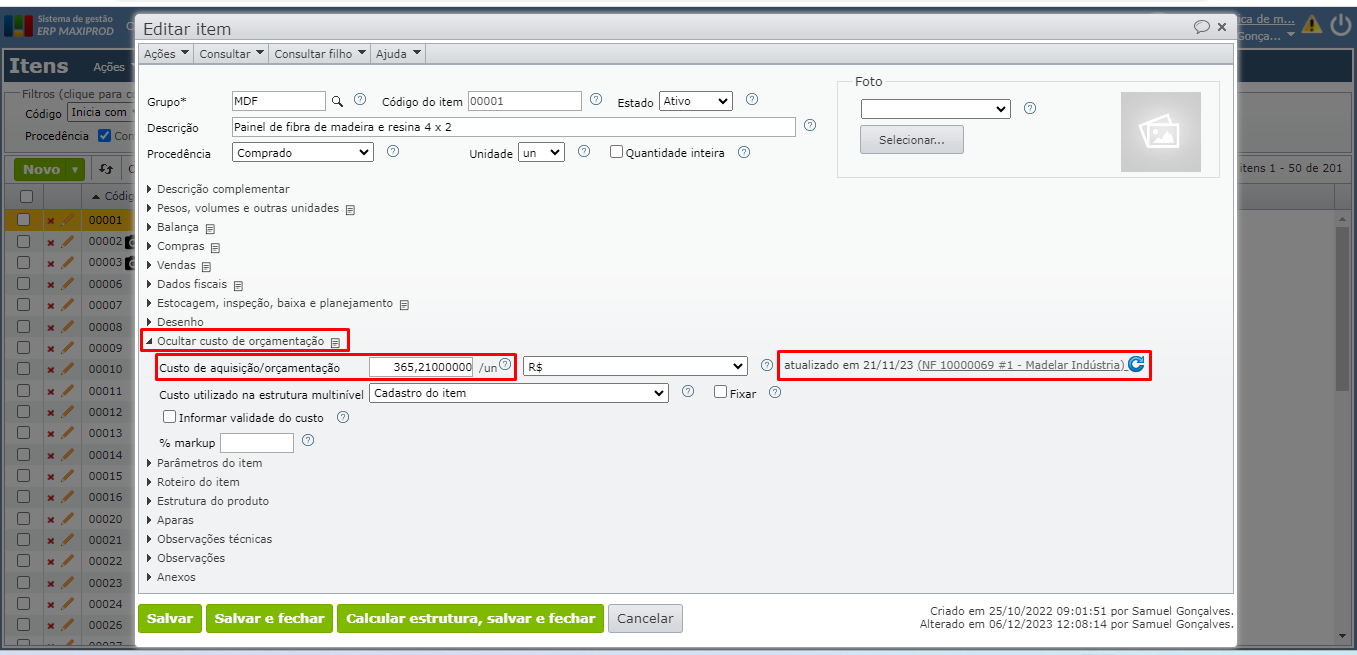 3) Na janela de edição do item, expanda a seção “Custo de aquisição/orçamentação” e veja o campo “Custo de aquisição/orçamentação”. Após o campo que indica a moeda na qual está sendo calculado o custo de aquisição, o sistema apresenta detalhes de quando e como ocorreu a última atualização do custo de aquisição.