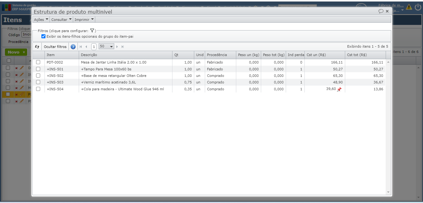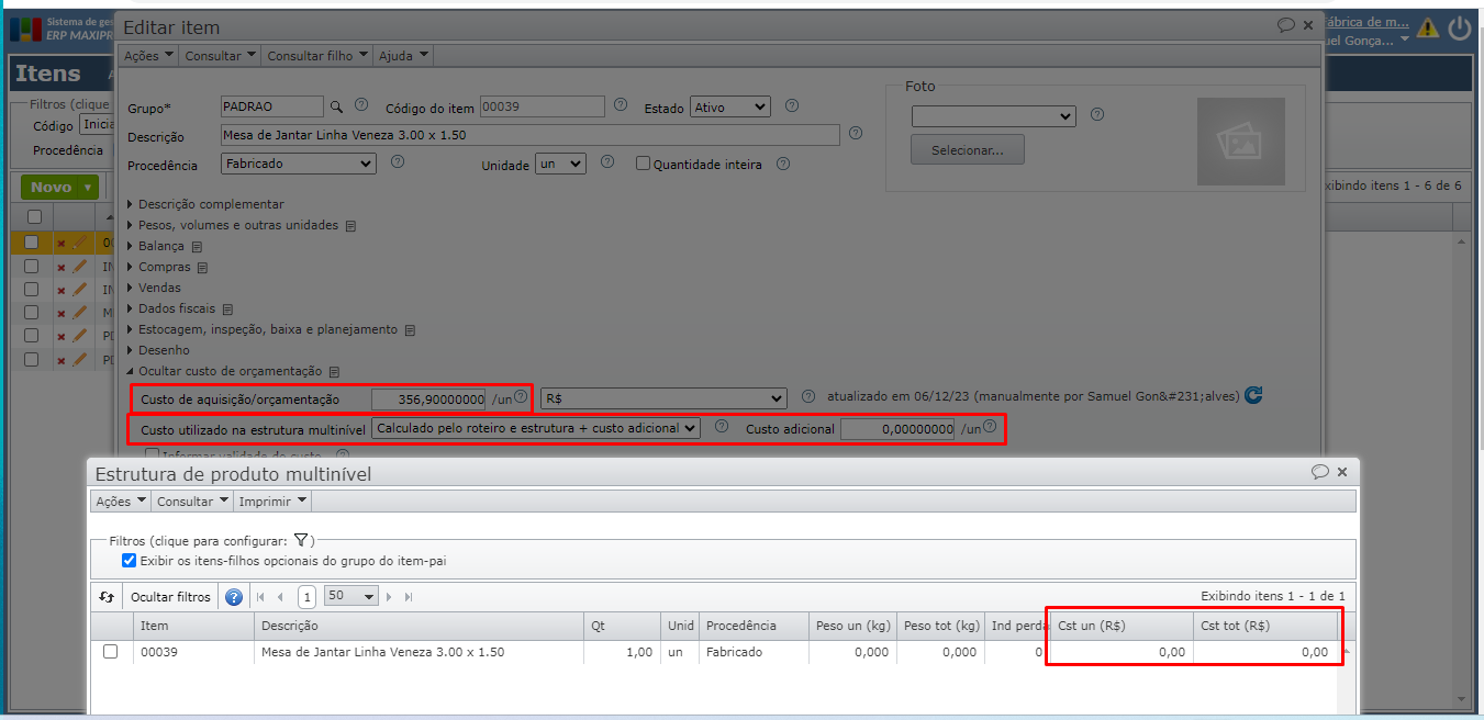 2) O custo do item é apresentado na estrutura multinível conforme o campo “Custo utilizado na estrutura multinível”.