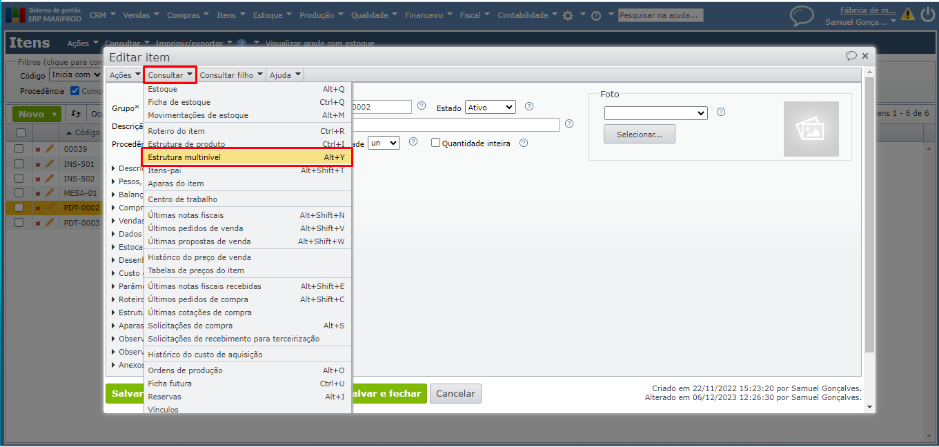 3) Para consultar a estrutura multinível de um item, utilize o menu “Consultar > Estrutura multinível” da janela de edição do item, ou da grade de itens.
