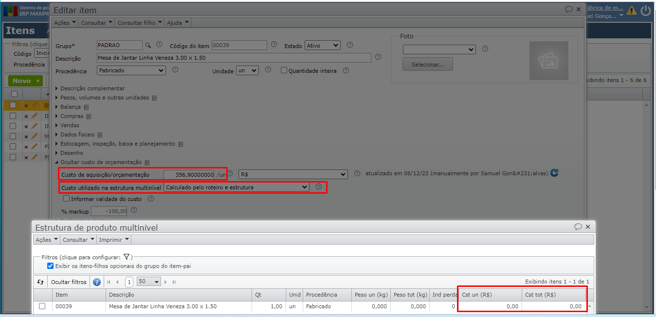 5) Itens com custo utilizado na estrutura multinível “Calculado pelo roteiro e estrutura”, mesmo que o campo “Custo de aquisição/orçamentação” esteja preenchido, se não tiver roteiro e/ou estrutura, ou as operações e/ou os itens da estrutura estiverem sem custo, na estrutura multinível será exibido com o custo zerado.