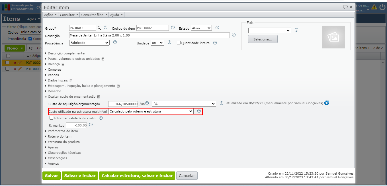 - Calculado pelo roteiro e estrutura: é a soma do custo da estrutura do produto e do roteiro.