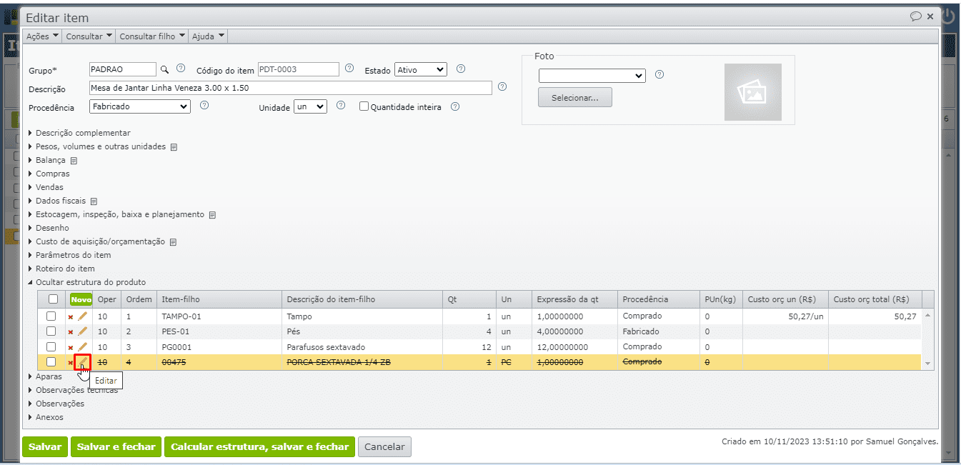 2) Para retornar a ligação pai-filho ao estado “Efetivo”, edite a estrutura de produto, clicando no ícone do lápis ou duplo-clicando a linha do item-filho.