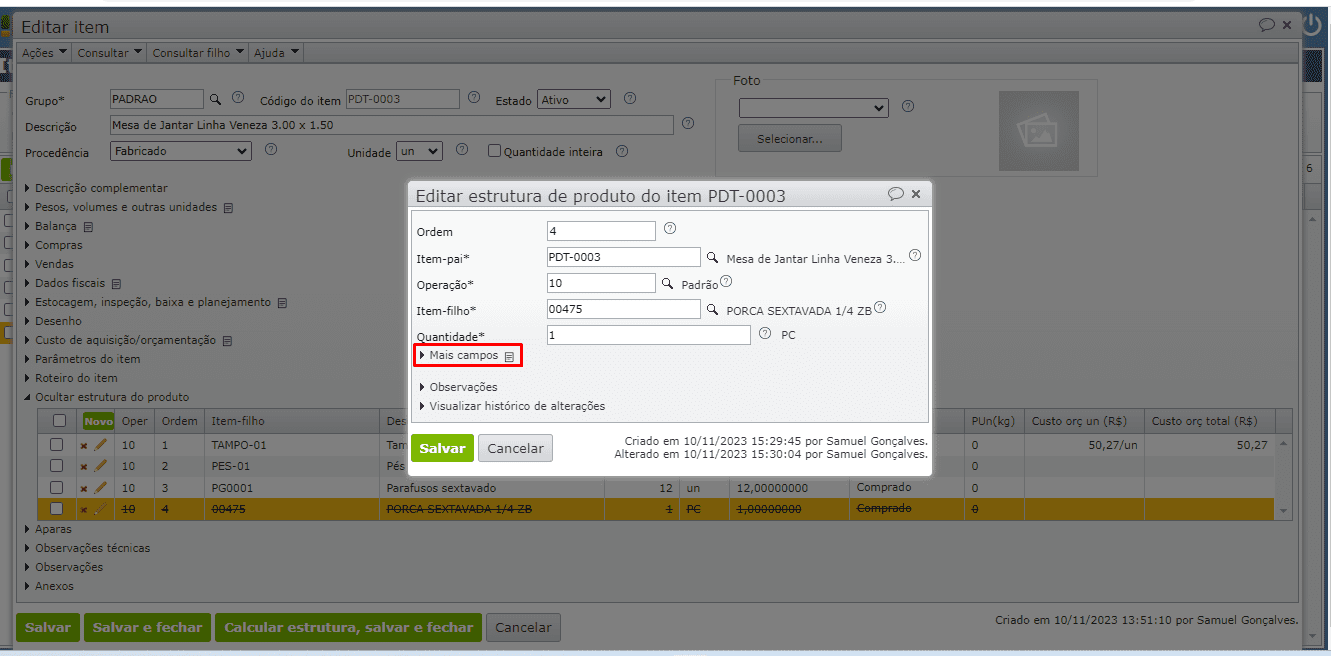 3) Na janela de edição do item-filho da estrutura, expanda a seção “Mais campos”.