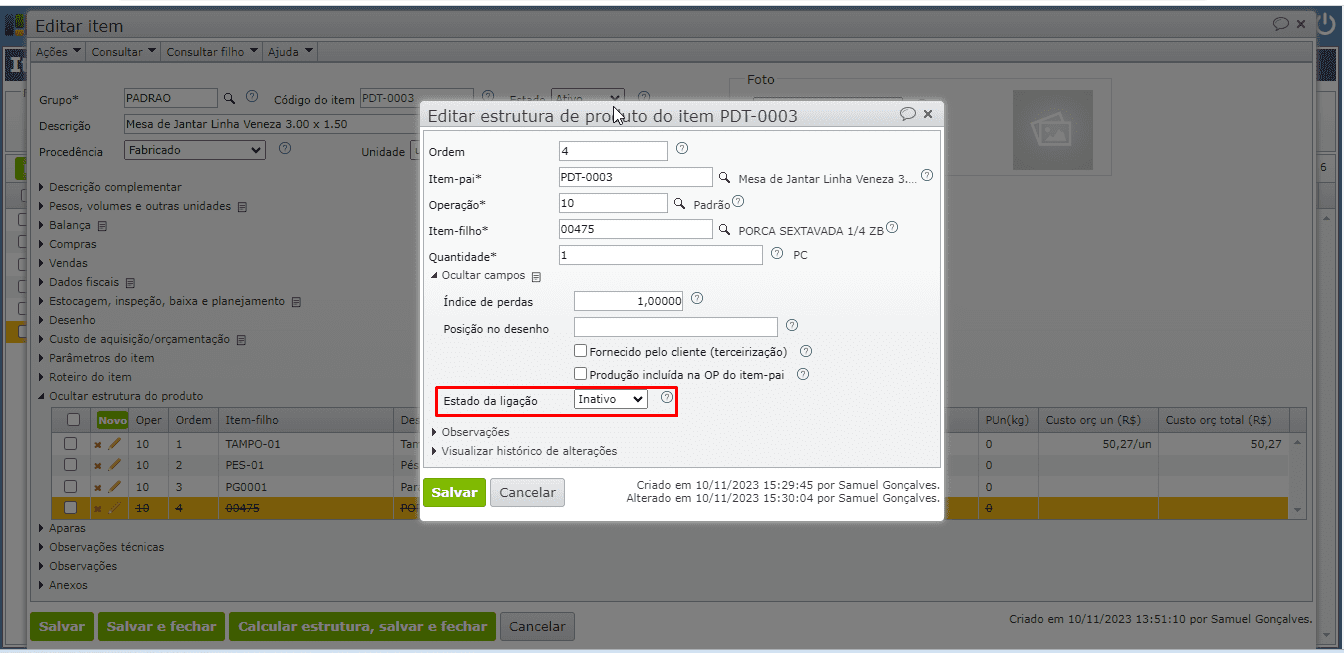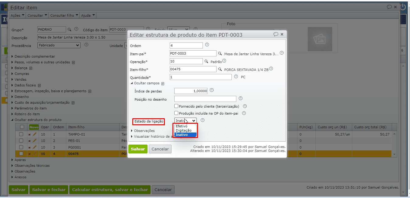 7) Portanto, mesmo que um item-filho esteja no estado “Inativo” na estrutura de produto, este item continua ativo, podendo ser utilizado como item-filho de outros produtos e ter a sua própria estrutura de produto.
