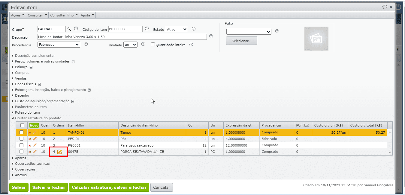 6) Quando o estado da ligação é “Digitação”, o item-filho é exibido na grade da estrutura de produto com o ícone “Lápis alaranjado” na coluna “Ordem”.