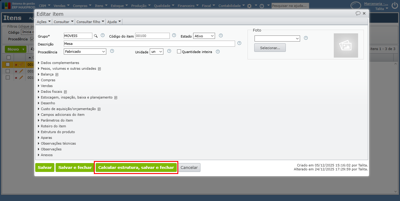 Quando o item-pai possui parâmetros cadastrados, a quantidade do item-filho pode ser definida por meio de uma expressão matemática que utiliza esses parâmetros. Nesse caso, a tela de edição da estrutura de produto disponibiliza o botão “Calcular estrutura, salvar e fechar”, responsável por realizar o cálculo e atualizar automaticamente as quantidades.