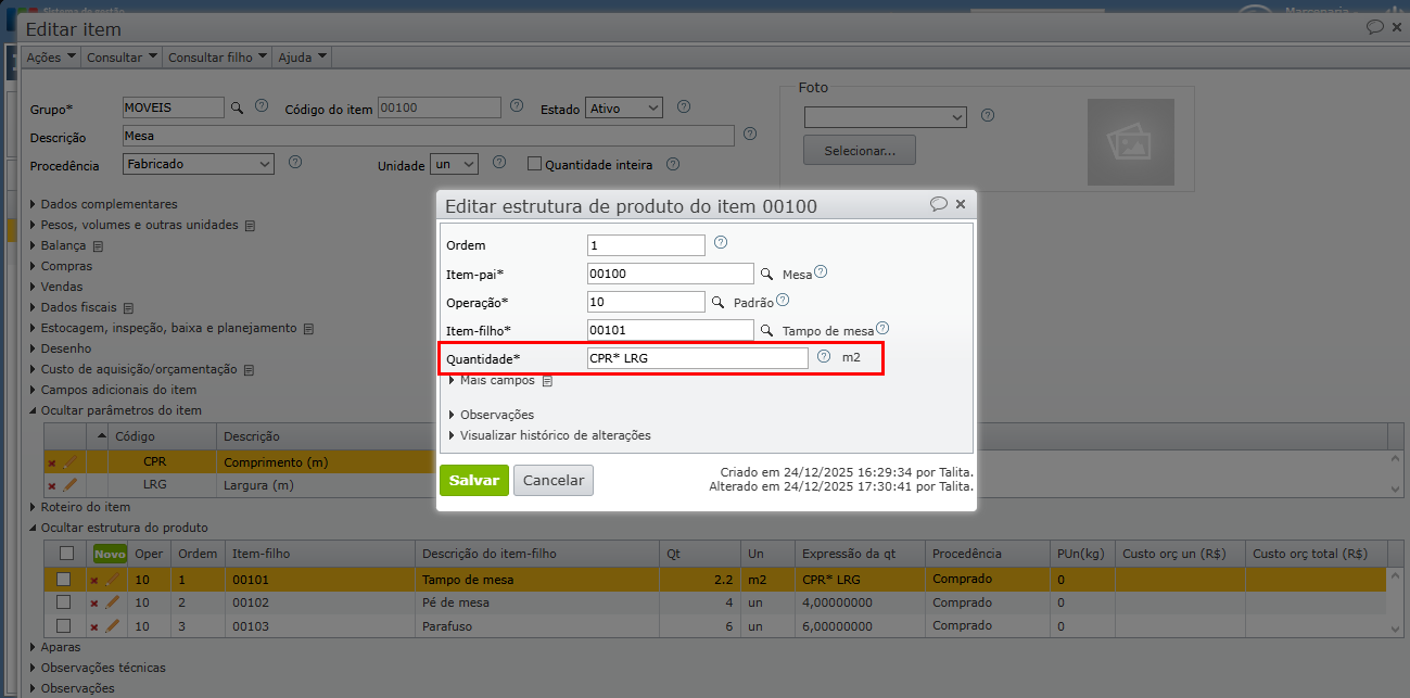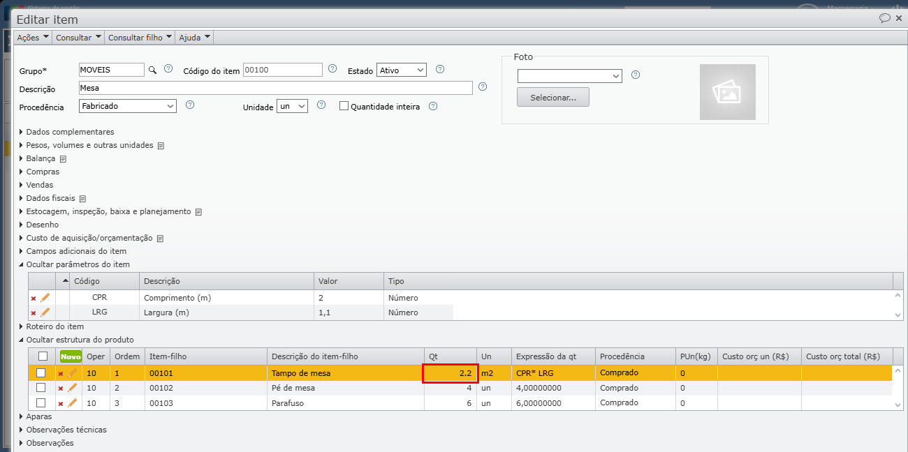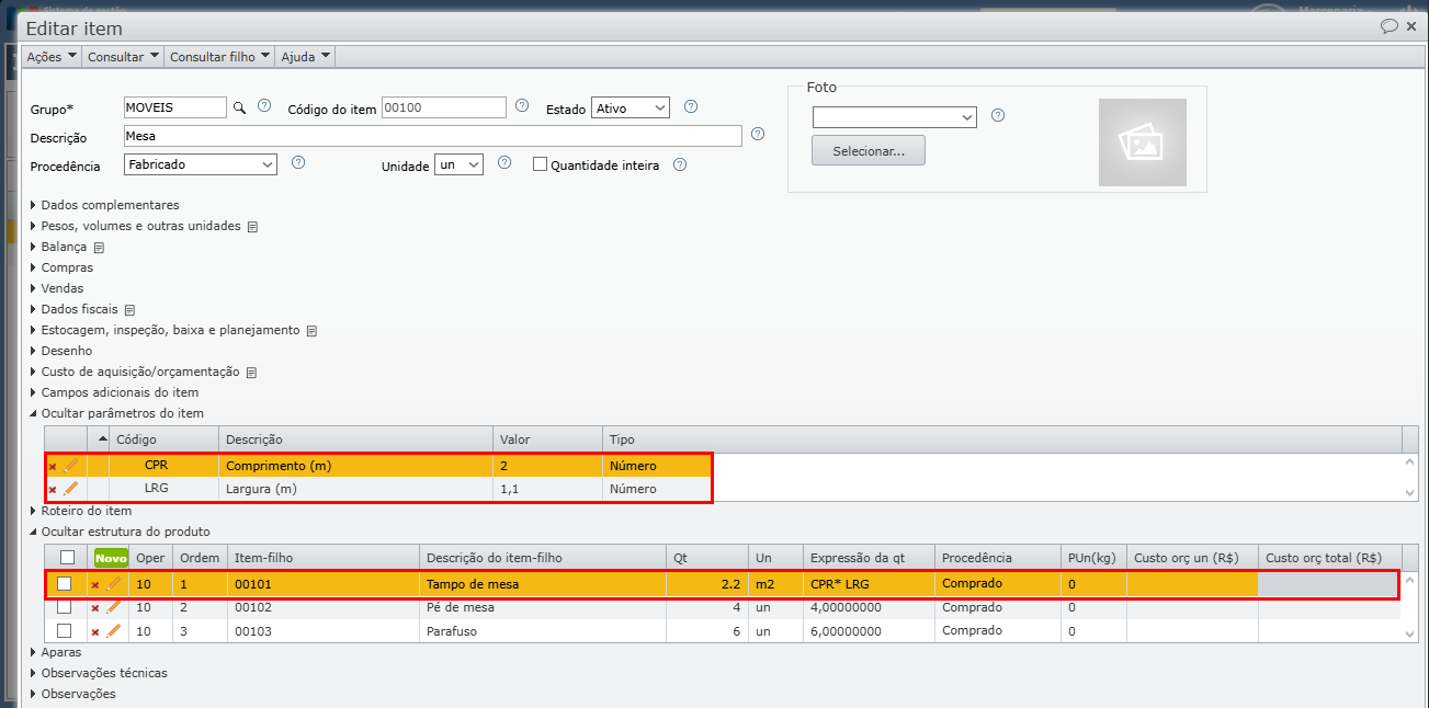 1) No exemplo abaixo, é apresentada a estrutura de produto do item Mesa que possui como item-filho o item Tampo de mesa. A quantidade foi definida por uma fórmula que calcula a quantidade do item-filho com base nos valores dos parâmetros CPR (Comprimento) e LRG (Largura) do item-pai.
