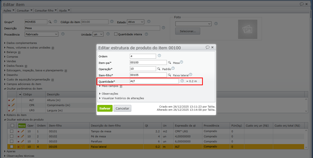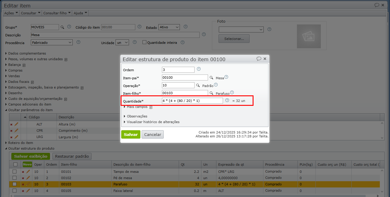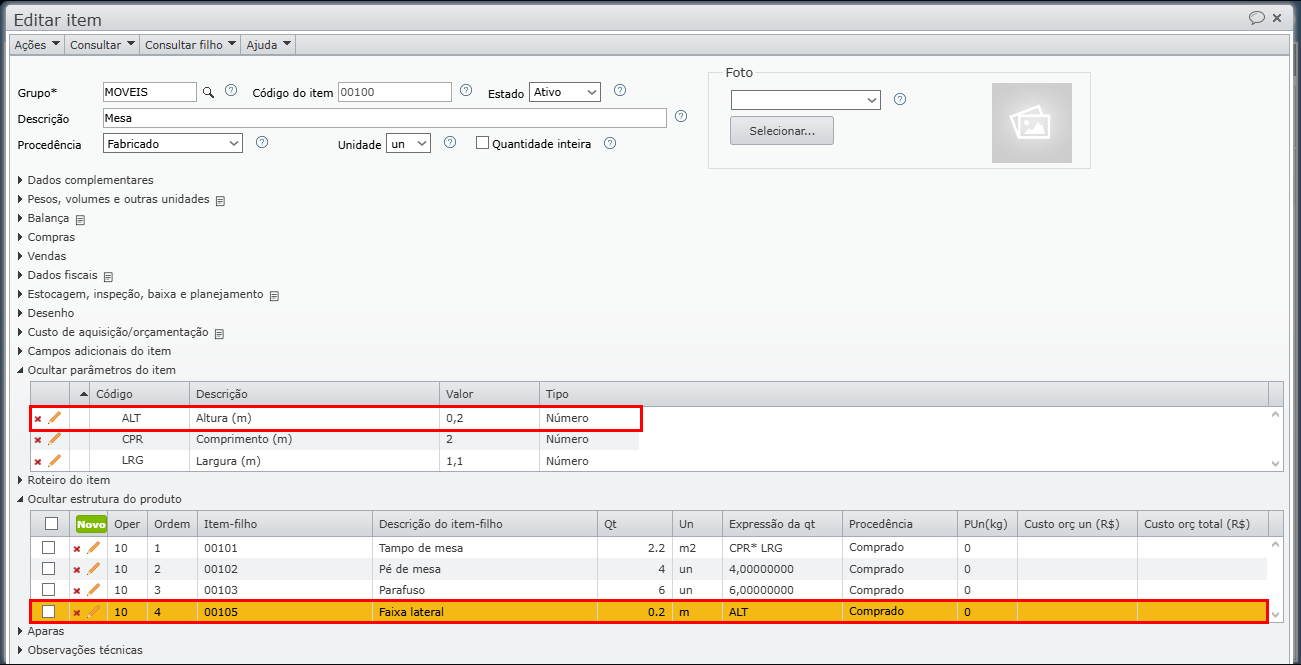 2) Considere o item Mesa, que possui o parâmetro ALT (altura) cadastrado. Ao inserir o item-filho Faixa lateral na estrutura de produto e definir uma expressão de quantidade baseada nesses parâmetros, o sistema realiza automaticamente o cálculo da quantidade necessária do item-filho para cada unidade do item-pai.
