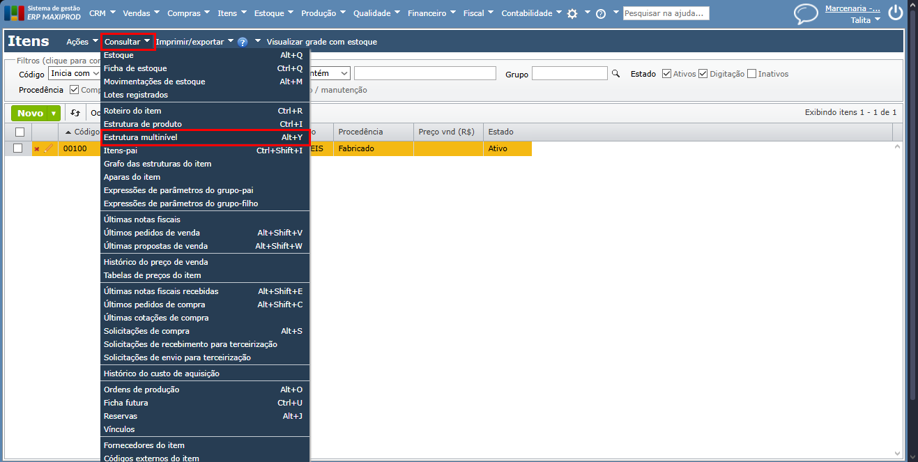 2) Selecione o item desejado (destacado em amarelo) e acesse o menu “Consultar > Estrutura multinível”.