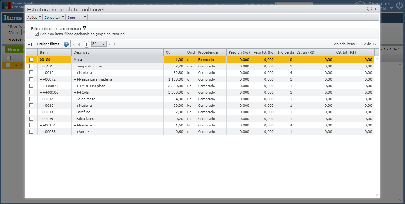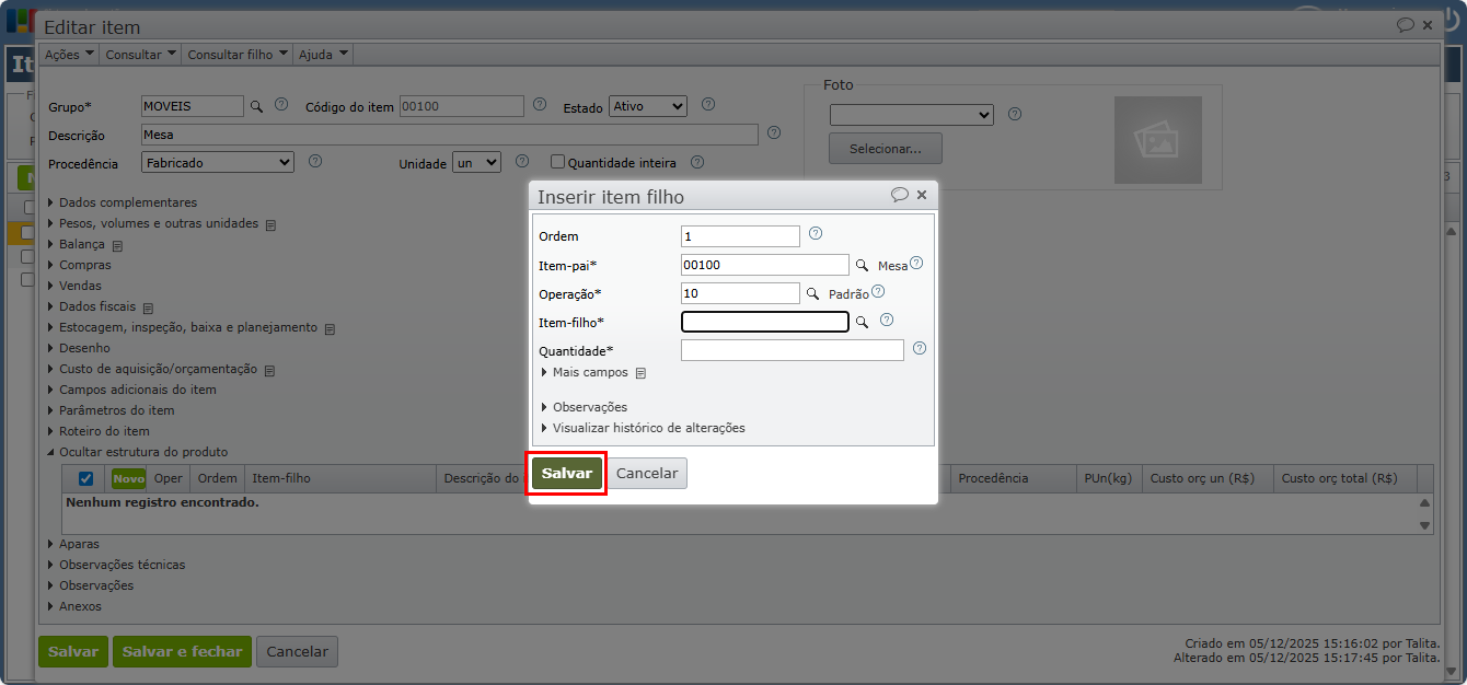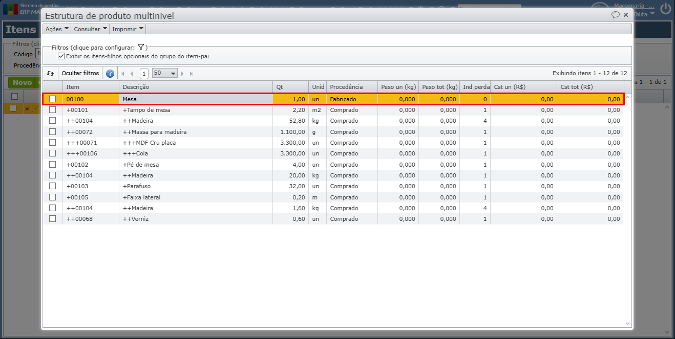 Importante: se a estrutura de produto tem mais de um nível, ou seja, para produzir um item-filho do produto final é necessário algum insumo. Exemplo: para produzir uma mesa, é necessário o tampo da mesa, mas para produzir o tampo, é necessária a madeira, realize o cadastro da estrutura de produto nos itens-filho. Para saber mais sobre estrutura multinível, clique aqui.