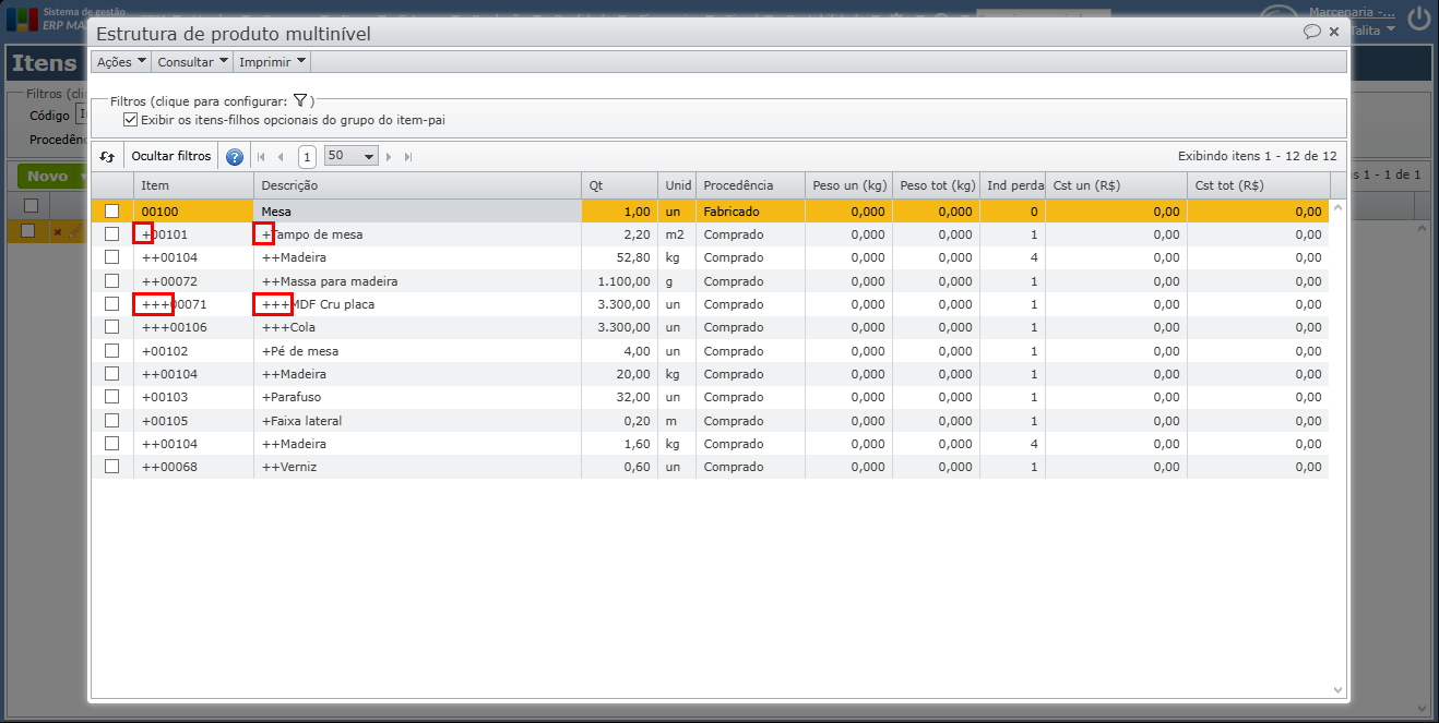 5) Por meio dos ícones de “+”, localizados à esquerda do código e da descrição do item, é possível identificar o nível em que cada item se encontra na estrutura de produção do item-pai. Quanto maior a quantidade de ícones de “+”, mais distante em níveis, o item está do item-pai, quanto menor a quantidade, mais próximo ele se encontra.