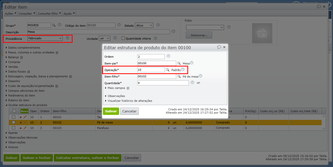 Para cadastrar um item-filho na estrutura de produto de um item-pai cuja procedência seja “Fabricado”, é obrigatório informar a operação do insumo. A operação representa os processos pelos quais o item passa durante a produção, como usinagem, solda, montagem, embalagem, entre outros. Para saber mais sobre roteiros de produção, clique aqui.