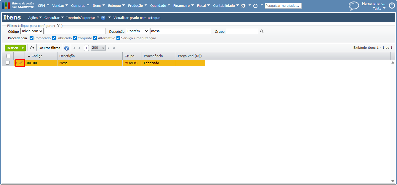2) Clique no ícone de lápis do item em que deseja cadastrar a estrutura de produto.