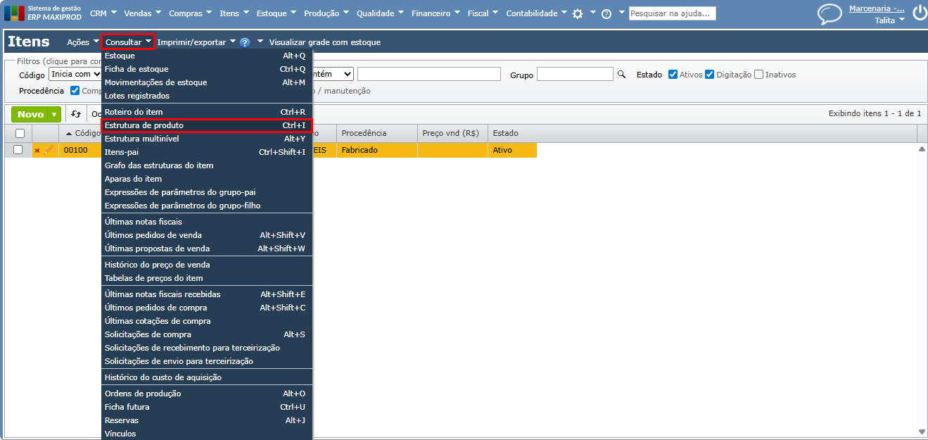 Observação: Também é possível cadastrar a estrutura de produto selecionando o item desejado (destacado em amarelo) e acessando o menu “Consultar > Estrutura de produto”.