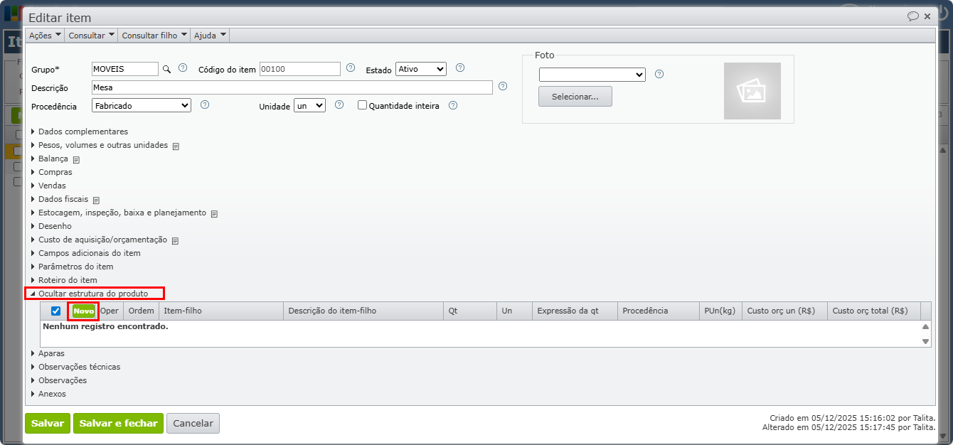 - Observações: campo de edição livre para observações internas sobre o item-filho.