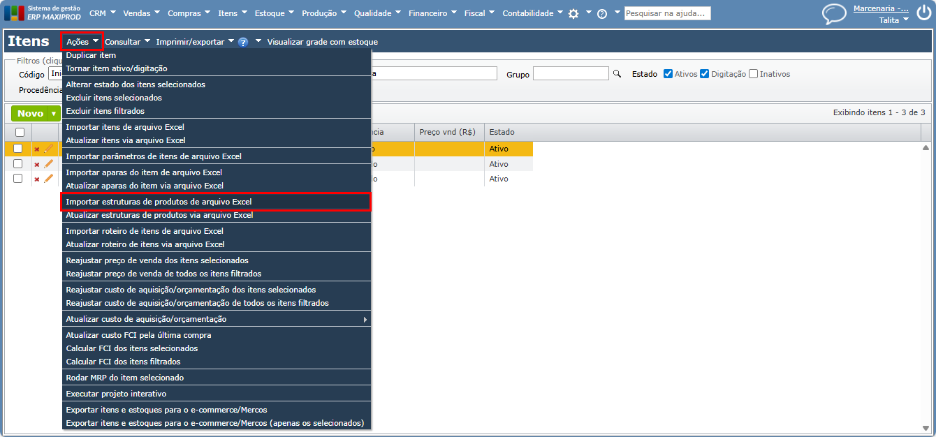2) Clique no menu “Ações > Importar estruturas de produtos de arquivo Excel”.