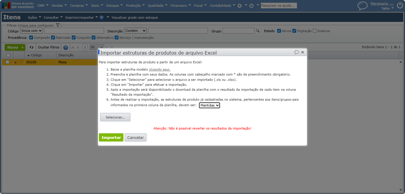 Para importar estruturas de produto por planilha Excel, é necessário que os itens-pai e itens-filho já estejam cadastrados no sistema e que o roteiro de produção do item-pai também esteja previamente cadastrado.