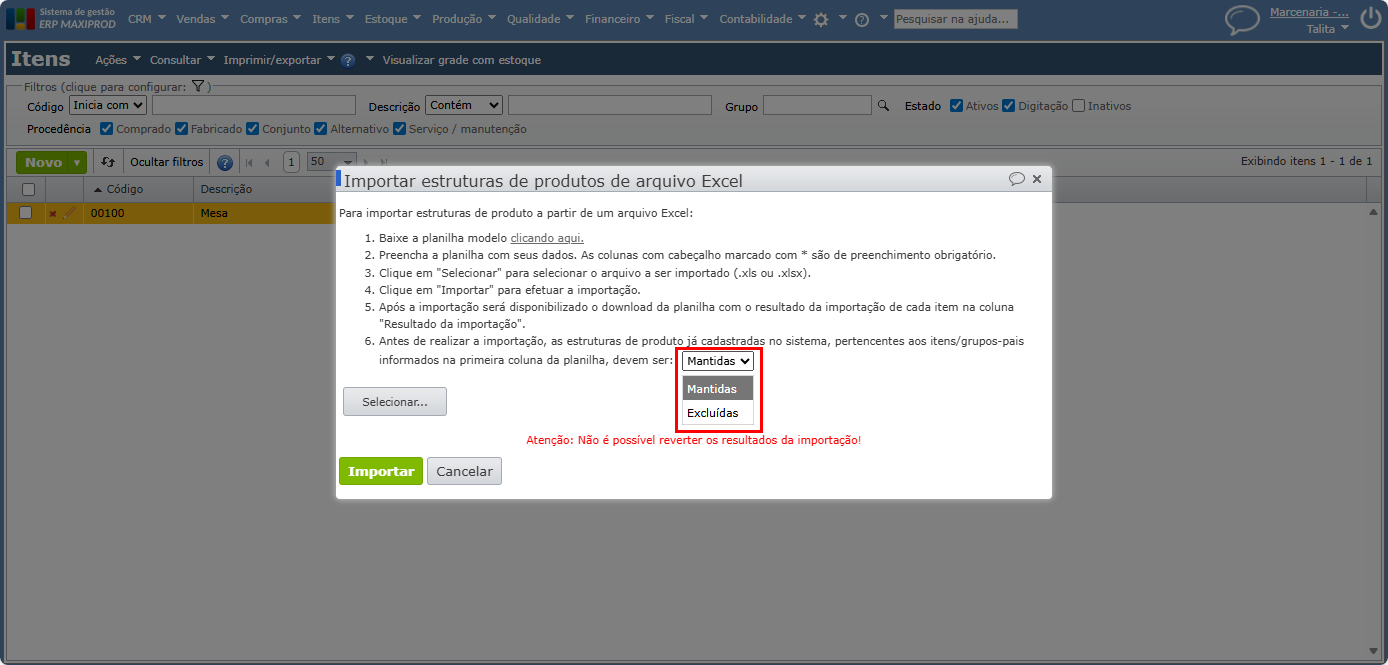 - “Mantidas”: Se for selecionada, assim que clicar no botão verde “Importar”, os itens/grupos-filhos informados na planilha serão acrescentados às estruturas de produtos dos itens/grupos-pais informados na coluna “Código do item-pai (ou grupo-pai) “. Portanto, ao utilizar a opção, os insumos presentes na planilha serão adicionados à estrutura de produto já cadastrada no item-pai.