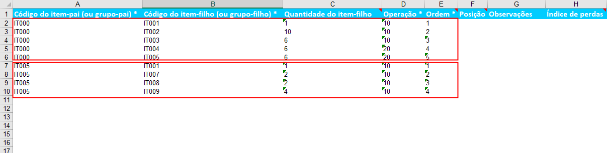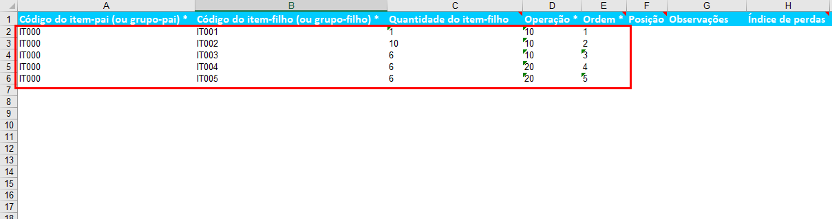 Exemplo: para importar quatro itens-filho para um mesmo item-pai, serão necessárias quatro linhas com o mesmo código de item-pai.