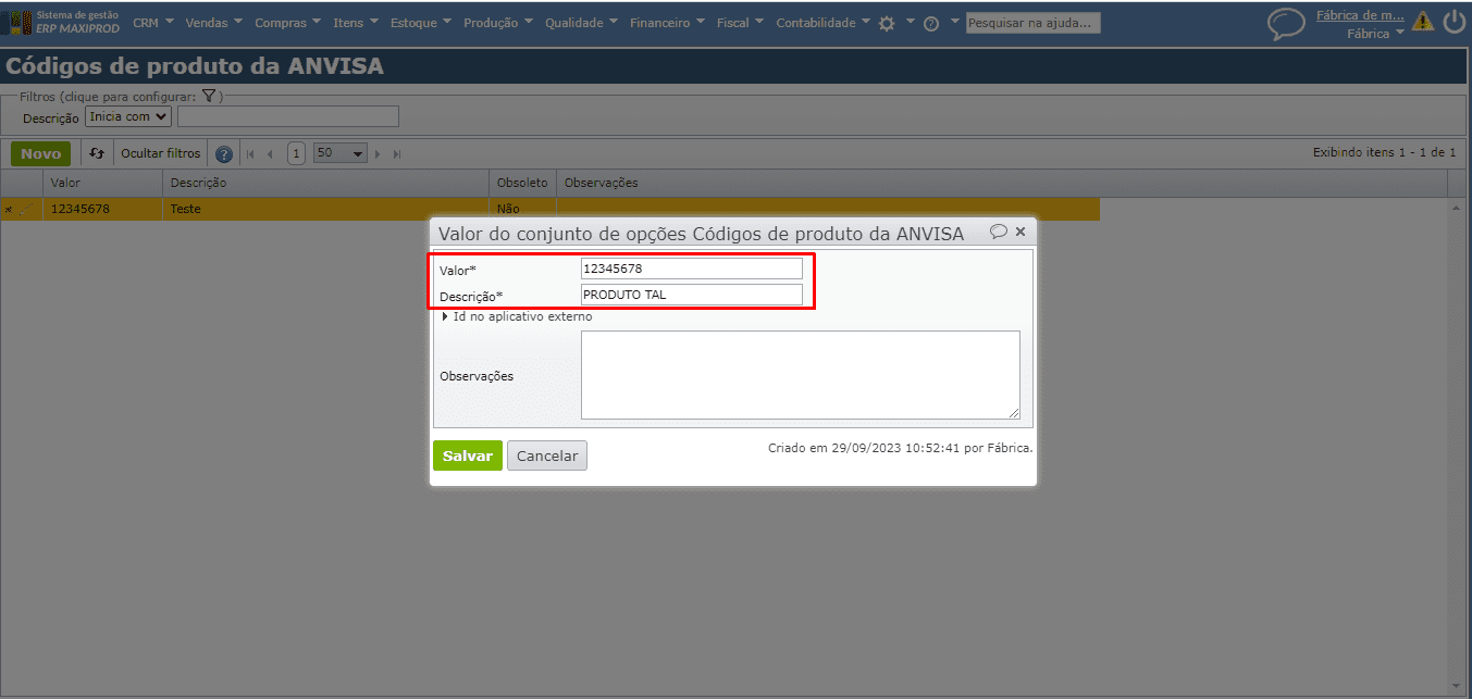 O ERP MAXIPROD disponibiliza de um campo para preenchimento do “Código de produto na ANVISA” no cadastro do item. Possuem códigos na ANVISA os produtos sujeitos à vigilância sanitária, é importante não confundir “Código de produto na ANVISA” com o “Código do processo de registro na ANVISA”, o primeiro é o código do registro, enquanto o segundo é o código do processo de registro.